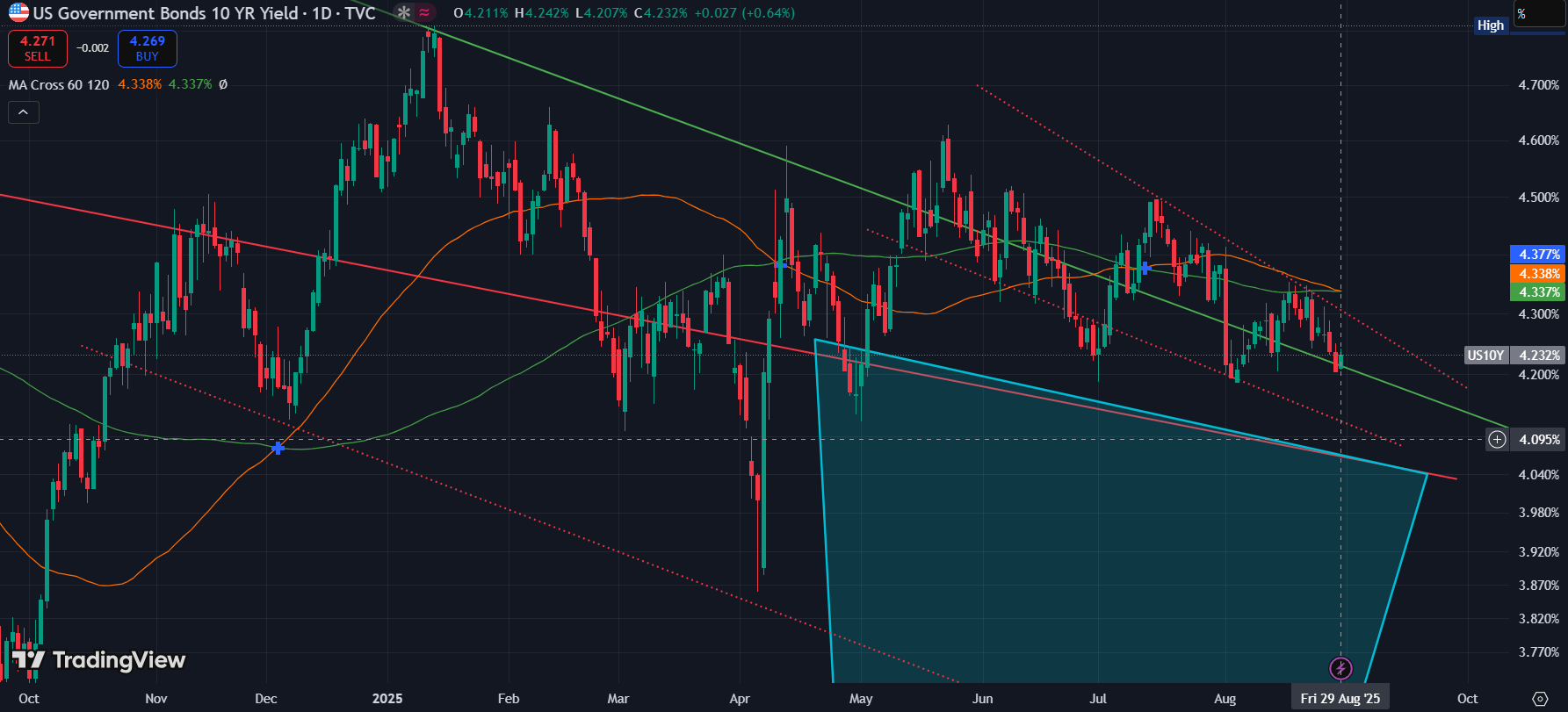 현재 상황: 미국 10년물 국채 금리가 대외재료 경계감으로 일제히 상승했으나, 연준의 9월 금리 인하 기대감이 상승 폭을 제한하고 있습니다. 현재 4.0-4.5% 구간에서 연준의 정책 변화 기대와 인플레이션 우려 사이의 줄다리기를 보이고 있으며, 고용시장 둔화 신호가 금리 하락 압력으로 작용하고 있습니다. B-C 구간에서 금리 변동성 확대는 중앙은행의 정책 딜레마를 반영하며, 경기 과열 우려에서 경기 둔화 우려로의 전환점에 위치해 있습니다. 위험자산 랠리의 지속적 전개를 위해서는 금리가 4% 이하로 안정적 진입이 필요하며, 고용시장 추가 둔화 확인 시 3.5-4.0% 구간까지 하락 가능성이 있습니다.