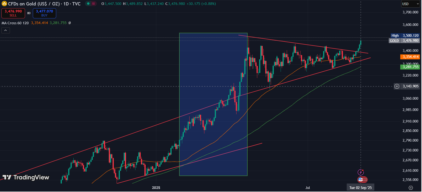 시장 현황: 3,516달러로 강세 지속. 안전자산 수요(Risk Off) + 실질금리 하락 기대(Risk On) 복합 작용으로 현재 시장의 애매한 성격을 반영