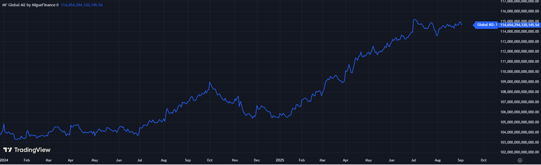 현재 상황: 미국 7월 고용지표가 73,000명 증가에 그치며 시장 예상을 크게 하회하고, 연준의 9월 17일 FOMC 회의에서 금리인하 가능성이 95.6%까지 상승하면서 확장적 통화정책 전환점이 임박했습니다. 7월 FOMC에서 2명의 연준 위원이 금리 인하를 지지하며 처음으로 반대표를 던진 것은 내부적으로 통화완화 압력이 증가하고 있음을 시사합니다. 현재의 금리인하 싸이클 중후반 시기, 중앙은행들이 경기 부양을 위한 유동성 공급 정책으로 전환하고 있어, 향후 글로벌 M2 확대가 가속화될 전망입니다. 다만 관세로 인한 인플레이션 압력 우려로 "단기간에는 인플레이션이 상승할 가능성"을 언급한 만큼, 통화량 확대 속도는 인플레이션 동향에 따라 조정될 수 있습니다.